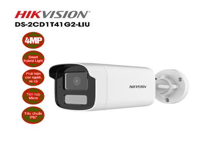 HIKVISION DS-2CD1T21G2-LIU là camera IP thân trụ 2MP (1920×1080), cảm biến 1/2.9″ CMOS, ống kính 2.8/4mm, Smart Hybrid Light hồng ngoại và ánh sáng trắng tầm 50m, phát hiện người và phương tiện, tích hợp mic, chuẩn IP67, nguồn 12V/PoE 802.3af, hỗ trợ Hik-Connect xem từ xa, bảo hành 24 tháng.